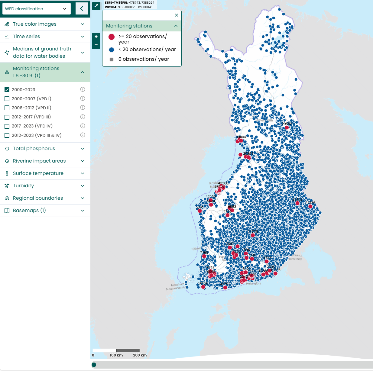 [EN] The monitoring stations GIS dataset represents the locations of monitoring stations in Finnish coastal waters and lakes and the quantity of samples for different water quality parameters. The dataset includes chlorophyll-a, turbidity, Secchi depth, water surface temperature, and colored dissolved organic matter derived from water color. The dataset includes the quantities of water sampling for different Water Framework Directive classification periods of 2000–2007, 2006–2012, 2012–2017, 2017–2023, and aggregates for 2012–2023 and 2000–2023.